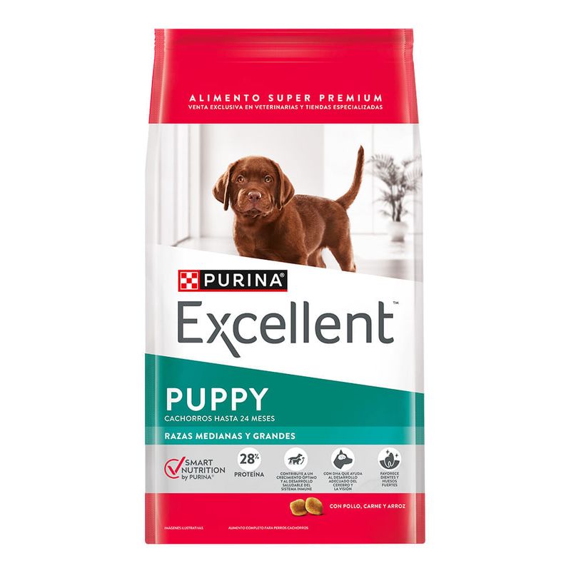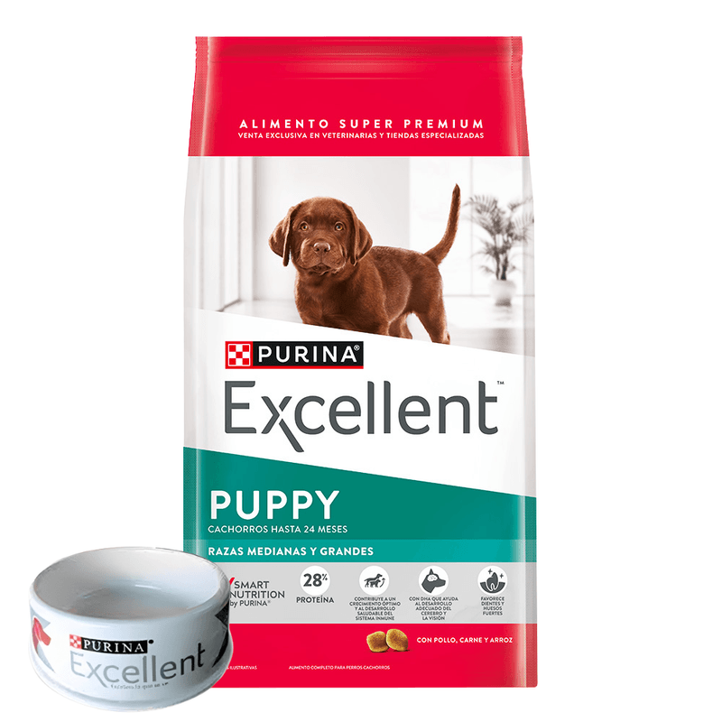 En su primer año de vida los cachorros necesitan una nutrición óptima para favorecer su desarrollo y crecimiento. PURINA® Excellent® PUPPY CHICKEN & RICE ofrece una fórmula completa y balanceada a base de proteínas de alta calidad, incluyendo tocoferoles mezclados -fuente de vitamina E- y sin colorantes ni saborizantes arti?ciales, para garantizar la calidad nutricional de sus fórmulas y un sabor único e irresistible.