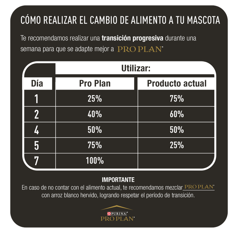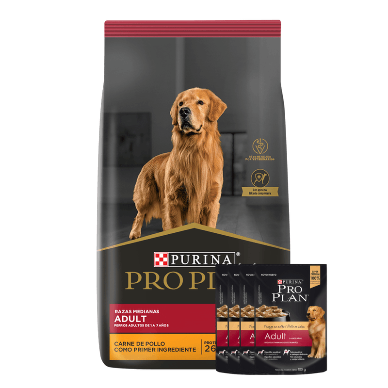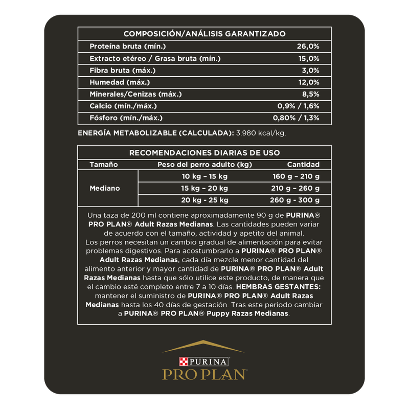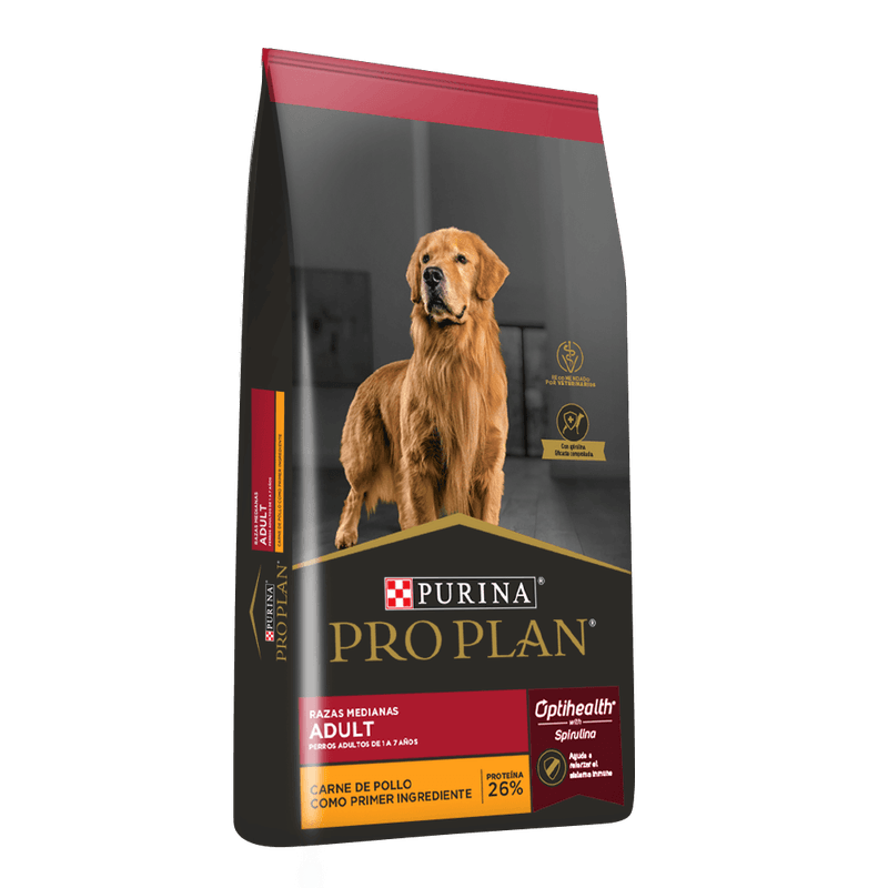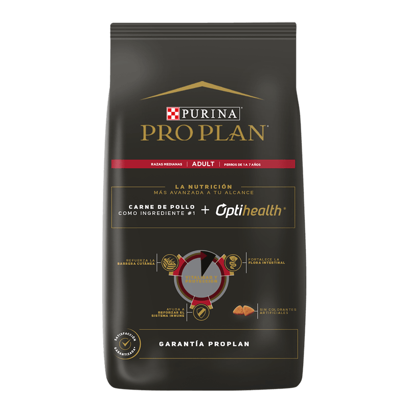 Purina Pro Plan provee nutrición de avanzada que ayuda a los perros de razas medianas a mantenerse fuertes y llenos de vitalidad. A su vez, también ayuda a otras cosas claves en el cuidado de la mascota, tales como reforzar el sistema inmune, fortalecer la microflora intestinal y reforzar la barrera cutánea. Esta fórmula ofrece, a través de sus sabrosas croquetas, un contenido rico en proteínas (26%) y grasas (15%), utilizando como ingrediente principal carne fresca de pollo, que ayuda a los perros a mantener la masa corporal magra y músculos fuertes.