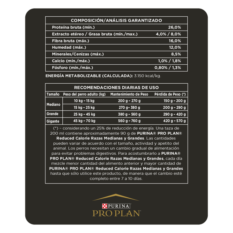 El Alimento Pro Plan Reduced Calorie está fabricado con una fórmula de vanguardia que ayuda a lograr un peso corporal ideal, facilita la pérdida de peso en forma sana y protege a largo plazo la salud general de tu mascota. Un peso corporal saludable y una condición corporal magra son de suma importancia para mejorar la salud y aumentar la longevidad de tu perro. Además, contiene fuente natural de tres tipos de fibras que sacian el apetito manteniendo a los perros satisfechos.