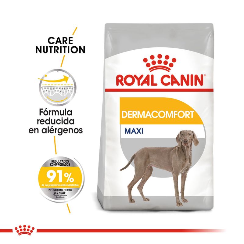 Alimento para perros adultos y Seniors de talla grande (de 26 a 44 kg) propensos a la irritación cutánea y al prurito, a partir de los 15 meses de edad. Royal Canin Maxi Dermacomfort posee una fórmula específica con una selección de fuentes de proteínas de muy alta calidad y está especialmente indicado para perros de tamaño grande propensos a la irritación de la piel y el prurito. Su combinación única de nutrientes ayuda a reforzar la barrera cutánea, ya que combina ácidos grasos Omega 6 (incluyendo al ácido gamma linolénico) y ácidos grasos Omega 3 (incluyendo EPA y DHA) conocidos por sus efectos beneficiosos para la piel. Además, satisface el apetito de los perros de talla grande gracias a los aromas rigurosamente seleccionados. Beneficios: Fórmula reducida en alérgenos.Presenta una combinación de nutrientes beneficiosos para la piel.Ayuda a reducir la formación de sarro.Formulado con ácidos grasos Omega 3 y 6, incluyendo GLA, EPA y DHA para ayudar a cuidar y nutrir su piel sensible, manteniendo un pelaje saludable. Ingredientes: Arroz, proteína vegetal purificada L.I.P.* (gluten detrigo), harina de trigo, grasas animales (vacuna y/o pollo), maíz, harina de gluten de maíz, granos de avena, sales minerales, hidrolizado de hígado de pollo y/o cerdo y/o vacuno, aceite de soja, pulpa de remolacha, aceite de pescado, celulosa purificada, semillas de lino, L-lisina, vitaminas, zeolita, fructo-oligosacáridos (FOS), taurina, DL-metionina, aceite de borraja, oligoelementos, extracto de rosa de la India (rico en luteína), oligoelementos quelados, L-carnitina. (*) Low Indigestible Protein: proteína seleccionada por su alta asimilación. Vitaminas: Colina, vitamina E, vitamina C, niacina, pantotenato de calcio, biotina, vitamina B6, vitamina B2, vitamina B1, vitamina A, ácido fólico, vitamina B12, vitamina D3. Sales minerales: Fosfato monocálcico, calcita, cloruro de sodio, cloruro de potasio, sorbato de potasio. Oligoelementos: Óxido de zinc, sulfato de hierro, óxido de manganeso, sulfato de cobre, selenio orgánico, iodato de calcio. Oligoelementos quelados: Zinc, manganeso, cobre. Conservantes y antioxidantes: BHA, galato de propilo y ácido cítrico. Proteína bruta (mín.): 23%