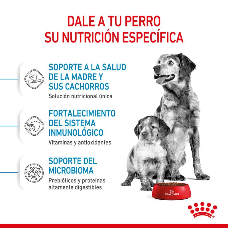Alimento balanceado completo para perras y cachorros de talla mediana (de 11 a 25 kg). Para perras en fase final de gestación y período de lactancia, y cachorros en el período de destete hasta los 2 meses de edad. Royal Canin Medium Starter Mother & Babydog brinda soporte a la madre durante la gestación y la lactancia ofreciendo un alimento rico en energía y nutrientes esenciales. Esto se debe a que la gestación y la lactancia son períodos estresantes para la perra debido a que atraviesa numerosos cambios fisiológicos y metabólicos. Durante el último tercio de gestación, ocurre el máximo crecimiento de los fetos, por lo cual, los requerimientos energéticos y nutricionales de la madre empiezan a aumentar siendo en promedio un 50% mayor que las necesidades de mantenimiento de una perra adulta no gestante. Además, este aumento de tamaño de los fetos limita el volumen del estómago y por lo tanto, la cantidad de alimento que la madre puede ingerir. Este alimento brinda una respuesta nutricional adaptada a los elevados requerimientos energéticos del cachorro en etapa de destete, facilitando a la vez, la transición de la leche materna al alimento seco. Esto es debido a que durante esta etapa, los cachorros aumentan sus requerimientos y la leche materna ya no es suficiente para cubrirlos. En este momento deben atravesar un cambio progresivo en su alimentación, que es acompañado por la erupción de los dientes de leche que facilitarán la ingesta de alimentos sólidos. Royal Canin Medium Starter Mother & Babydog presenta una croqueta de tamaño, forma y dureza especialmente diseñados para facilitar la transición de una dieta líquida a una dieta sólida, ya que las croquetas se rehidratan fácilmente, logrando una consistencia de papilla muy palatable para el cachorro y su madre. Beneficios: Brinda soporte durante la gestación y lactancia.Facilita la transición de la lecha materna al alimento seco.Adaptado a los elevados requerimientos energéticos del cachorro.Fácil rehidratación de las croquetas. Ingredientes: Harina de subproductos de pollo, arroz, proteína vegetal purificada L.I.P.* (gluten de trigo),aceite de pollo, maíz, pulpa de remolacha, hidrolizado de hígado de pollo, sales minerales, grasa vacuna, aceite de pescado, aceite de soja, zeolita, vitaminas, L-lisina, fructo-oligosacáridos (FOS), manano-oligosacáridos (MOS), taurina, extracto de rosa de la India (rico en luteína), betaglucanos, DL-metionina, oligoelementos quelados, oligoelementos, butirato de sodio, L-carnitina, betacarotenos.(*) Low Indigestible Protein: proteína seleccionada por su alta asimilación. Vitaminas: Colina, vitamina E, vitamina C, pantotenato de calcio, vitamina A, niacina, vitamina B6, biotina, vitamina B1, vitamina B12, vitamina D3, vitamina B2, ácido fólico. Sales minerales: Fosfato monocálcico, cloruro de potasio, cloruro de sodio, sorbato de potasio, calcita. Oligoelementos: Óxido de zinc, sulfato de hierro, óxido de manganeso, sulfato de cobre, iodato de calcio, selenio orgánico. Oligoelementos quelados: Zinc, manganeso, cobre. Conservantes y antioxidantes: BHA, galato de propilo y ácido cítrico.