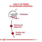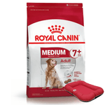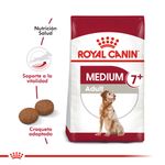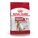 Alimento para perros Seniors de talla mediana (de 11 a 25 kg), desde los 7 a los 10 años de edad. Royal Canin Medium Adulto 7+ aporta un contenido adaptado de nutrientes para ayudar a mantener la vitalidad en perros de talla mediana frente a los primeros signos del envejecimiento, y contiene un exclusivo complejo de antioxidantes que ayuda a neutralizar a los radicales libres. Ayuda a mantener una digestibilidad óptima gracias a una fórmula exclusiva que incluye proteínas de alta calidad y un aporte balanceado de fibras dietarias. Además, su fórmula contiene nutrientes que ayudan a mantener una piel y un pelaje saludable y se encuentra enriquecida con EPA-DHA. Beneficios: Contribuye a mantener la vitalidad en perros de talla mediana frente a los primeros signos del envejecimiento.Ayuda a mantener una digestibilidad óptima.Contribuye a mantener una piel y un pelaje saludable. Ingredientes: Harina de subproductos de pollo, maíz, arroz, harinade trigo, proteína vegetal purificada L.I.P.* (gluten de trigo), hidrolizado de hígadode pollo, pulpa de remolacha, grasas vacuna, aceite de pollo, aceite de pescado,sales minerales, aceite de soja, levadura de cerveza, cáscara de psyllium,vitaminas, fructo-oligosacáridos (FOS), tirosina, manano-oligosacáridos (MOS),taurina, DL-metionina, aceite de borraja, L-lisina, oligoelementos quelados,oligoelementos, extracto de rosa de la India (rico en luteína), extracto de téverde (rico en polifenoles), L-carnitina.(*) Low Indigestible Protein: proteína seleccionada por su alta asimilación.Vitaminas: Vitamina A, vitamina D3, vitamina E, vitamina C, pantotenato decalcio, niacina, vitamina B1, vitamina B2, vitamina B6, ácido fólico, biotina,vitamina B12, colina.Sales minerales: Cloruro de potasio, calcita, sorbato de potasio, politrifosfastode sodio, cloruro de sodio.Oligoelementos: Sulfato de hierro, óxido de zinc, óxido de manganeso, sulfatode cobre, selenio orgánico, iodato de calcio.Oligoelementos quelados: Zinc, manganeso, cobre.Conservantes y antioxidantes: BHA, galato de propilo y ácido cítrico.