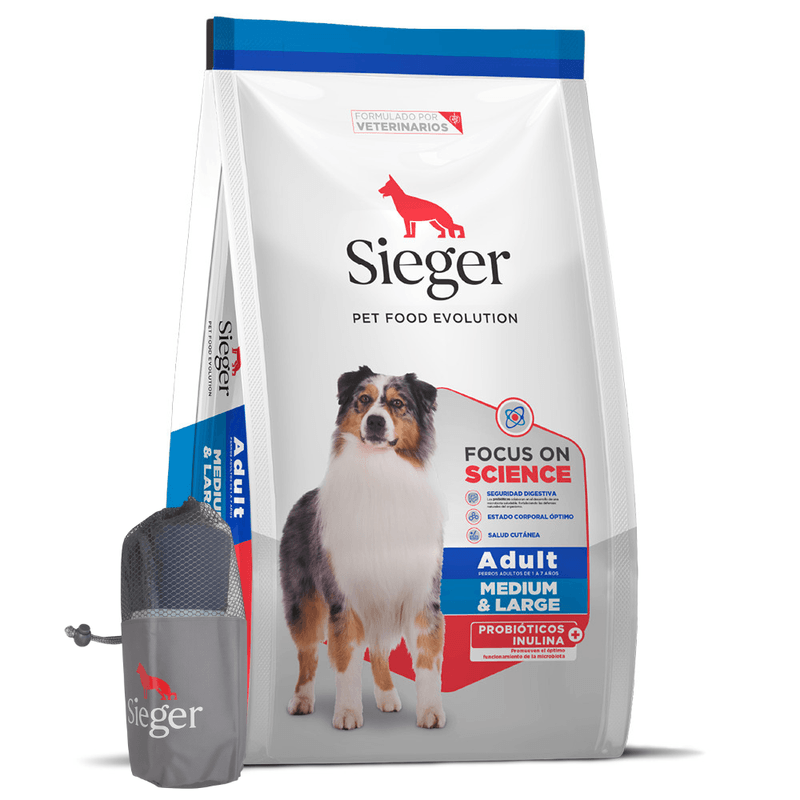 El Alimento Sieger Perro Adulto está diseñado para cubrir los requerimientos nutricionales específicos de tu perro, desde 1 a 7 años de edad. Su fórmula ofrece una equilibrada combinación de nutrientes, que contribuyen con el óptimo funcionamiento del sistema digestivo, ayudan a mantener activo el sistema inmunológico y favorecen la salud de la piel. La inclusión de Glucosamina y Condroitín sulfato promueve la salud osteoarticular en perros de estructura mediana y grande.