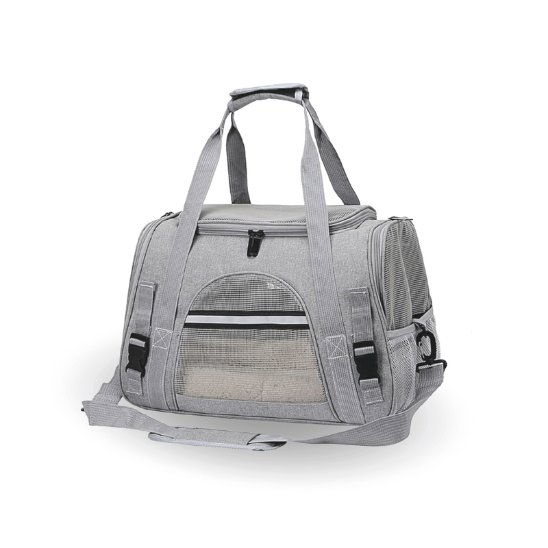 Beneficios destacados Uso convertible: se puede llevar como bolso de mano o al hombro gracias a sus correas regulables Aprobado para aerolíneas: con medidas de 43?×?25?×?28?cm y cinturón de seguridad, es ideal para traslados en avión Ventilación 360°: malla reforzada en laterales y parte superior asegura aire fresco y buena visibilidad Interior mullido: piso tipo corderito o acolchado que brinda confort y calidez al animal Bolsillos funcionales: laterales y traseros para almacenar snacks, documentos o accesorios esenciales Tela resistente e impermeable: construida en materiales de alta calidad, apta para distintos climas y entornos Especificaciones técnicas: Dimensiones externas: 43?cm largo ×?25?cm ancho ×?28?cm alto Peso aproximado: 0,9?kg . Carga máxima: ideal para mascotas pequeñas y medianas, hasta?7?kg (según variante) Colores disponibles: azul, gris, rosa, negro, entre otros . Modo de uso recomendado: Abre las cremalleras y coloca dentro el cinto de seguridad si vas en vehículo o aerolínea. Ajusta la correa o asas según el tipo de transporte (mano/hombro). Coloca el interior acolchado para que tu mascota esté cómoda. Asegurate de dejar las mallas ventiladas