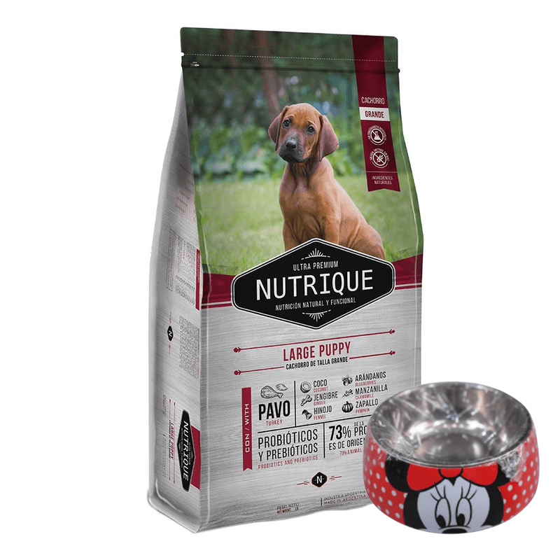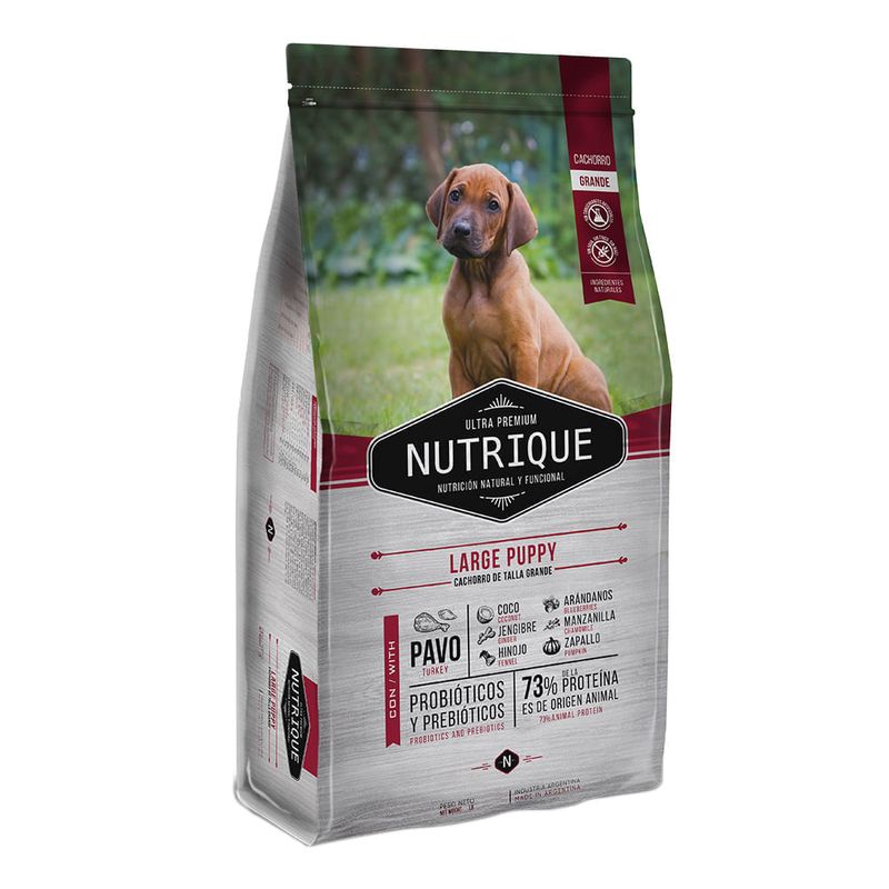 Nutrique reúne cualidades únicas, que la distinguen de la nutrición super premium, dando origen a una nueva categoría, superior a lo establecido. Estas son las principales características de excelencia que definen a Nutrique como la Nutrición Ultra Premium. Se caracteriza por revolucionar el paradigma de la nutrición, gracias a la innovadora combinación que reúne las ventajas excepcionales de la alimentación Natural con los efectivos beneficios de la Funcional. Nutrique Large Puppy con el exclusivo Smart Growth Complex. Es la combinación perfecta de ingredientes naturales, elegidos específicamente para fortalecer las funciones cognitivas, inmunitarias y de desarrollo general, críticas en la etapa de cachorro. Promueve el desarrollo saludable del perro de talla grande y lo prepara para una vida adulta equilibrada y vital. Compuesto de probióticos y prebióticos contiene el 73% de la proteína de origen animal.