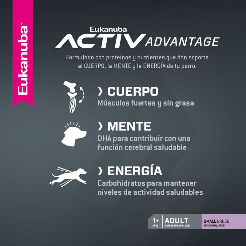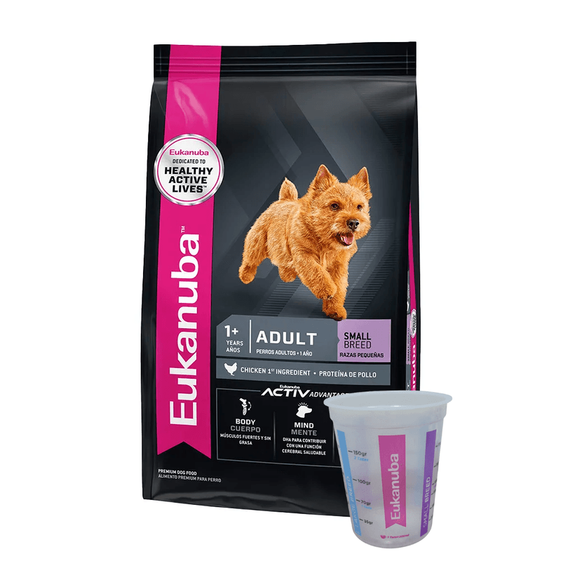 Eukanuba Puppy Small Breed es un alimento balanceado completo para cachorros entre 1 y 12 meses de edad y de razas pequeñas como Caniche, Yorkshire Terrier, Chihuahua, Daschund, Maltes y otras razas o perros mestizos que en su etapa adulta pesen menos de 10 kg. Las fórmulas para cachorro de Eukanuba, contienen niveles científicamente comprobados de DHA ara apoyar el óptimo desarrollo neurológico del cachorro y maximizar su capacidad de aprendizaje durante el entrenamiento. Contribuye a una óptima digestión, desarrollo y mantenimiento de músculos magros, articulaciones y huesos fuertes. Beneficios: Chicken Protein - Fuente de protei´na de origen animal con un alto porcentje de aminoácidos esenciales altamente digestibles, para desarrollar y mantener mu´sculos magros. Fórmula con DHA - contribuye nutricionalmente a facilitar el proceso de aprendizaje y entrenamiento del cachorro.Crecimiento del cachorro - contiene un correcto balance de minerales para promover huesos fuertes. Ingredientes: Harina de subproductos de pollo, harina de maíz, trigo integral molido, grasa de pollo, arroz de cervecería, pulpa de remolacha seca, producto de huevo seco, sabor natural a cerdo y/o pollo, aceite de pescado, Levadura de cerveza seca, harina de pescado, fosfato dicálcico, sal, vitaminas (suplemento de vitamina E, ácido ascórbico, beta caroteno, acetato de vitamina A, pantotenato de calcio, biotina, suplemento de vitamina B12, mononitrato de tiamina (fuente de vitamina B1), niacina, suplemento de riboflavina (fuente de vitamina B2), inositol, hidrocloruro de piridoxina (fuente de vitamina B6), suplemento de vitamina D3, ácido fólico), cloruro de potasio, minerales (sulfato ferroso, óxido de zinc, sulfato de manganeso, sulfato de cobre, óxido manganoso, iodato de calcio, carbonato de cobalto), cloruro de colina, antioxidante (BHA y BHT), DL-metionina, fructooligosacáridos, luteína.