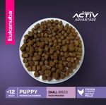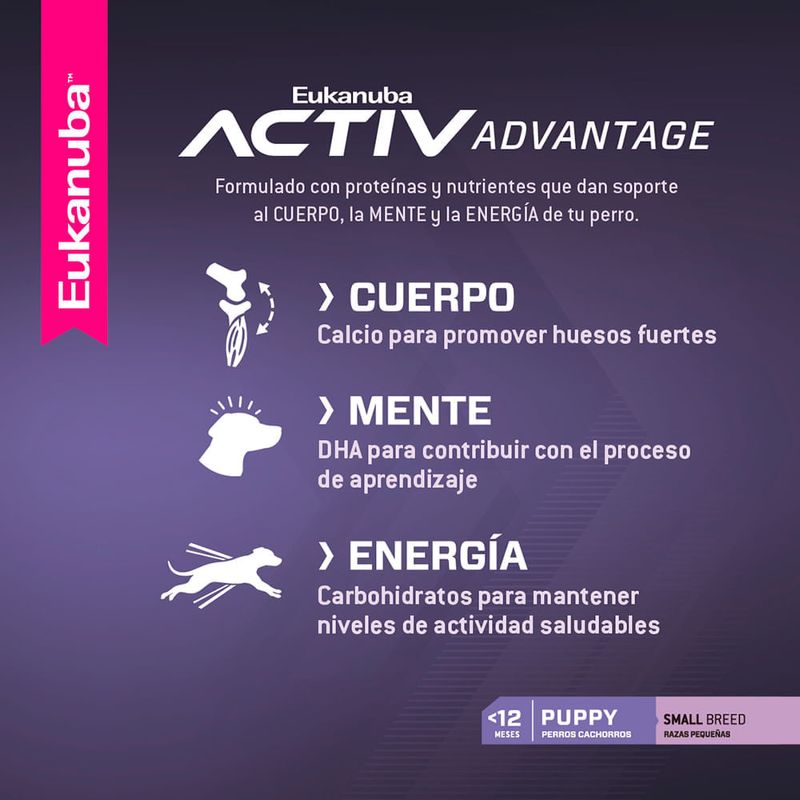 Eukanuba Puppy Small Breed es un alimento balanceado completo para cachorros entre 1 y 12 meses de edad y de razas pequeñas como Caniche, Yorkshire Terrier, Chihuahua, Daschund, Maltes y otras razas o perros mestizos que en su etapa adulta pesen menos de 10 kg. Las fórmulas para cachorro de Eukanuba, contienen niveles científicamente comprobados de DHA ara apoyar el óptimo desarrollo neurológico del cachorro y maximizar su capacidad de aprendizaje durante el entrenamiento. Contribuye a una óptima digestión, desarrollo y mantenimiento de músculos magros, articulaciones y huesos fuertes. Beneficios: Chicken Protein - Fuente de protei´na de origen animal con un alto porcentje de aminoácidos esenciales altamente digestibles, para desarrollar y mantener mu´sculos magros. Fórmula con DHA - contribuye nutricionalmente a facilitar el proceso de aprendizaje y entrenamiento del cachorro.Crecimiento del cachorro - contiene un correcto balance de minerales para promover huesos fuertes. Ingredientes: Harina de subproductos de pollo, harina de maíz, trigo integral molido, grasa de pollo, arroz de cervecería, pulpa de remolacha seca, producto de huevo seco, sabor natural a cerdo y/o pollo, aceite de pescado, Levadura de cerveza seca, harina de pescado, fosfato dicálcico, sal, vitaminas (suplemento de vitamina E, ácido ascórbico, beta caroteno, acetato de vitamina A, pantotenato de calcio, biotina, suplemento de vitamina B12, mononitrato de tiamina (fuente de vitamina B1), niacina, suplemento de riboflavina (fuente de vitamina B2), inositol, hidrocloruro de piridoxina (fuente de vitamina B6), suplemento de vitamina D3, ácido fólico), cloruro de potasio, minerales (sulfato ferroso, óxido de zinc, sulfato de manganeso, sulfato de cobre, óxido manganoso, iodato de calcio, carbonato de cobalto), cloruro de colina, antioxidante (BHA y BHT), DL-metionina, fructooligosacáridos, luteína.