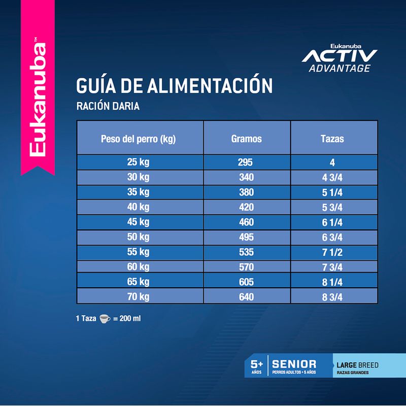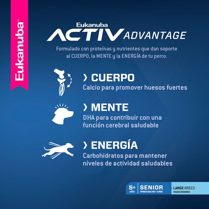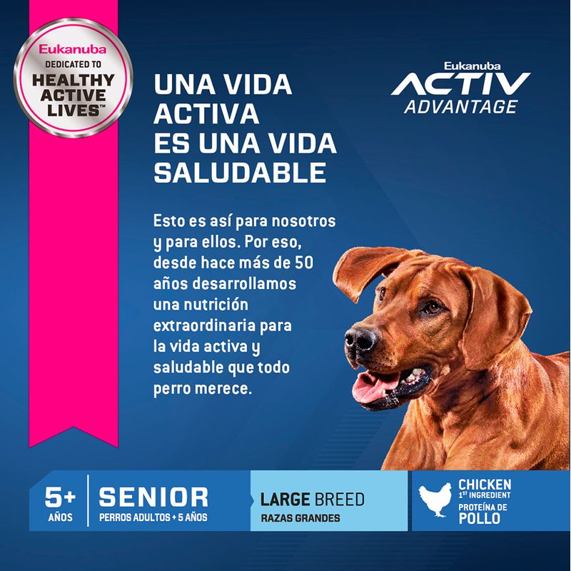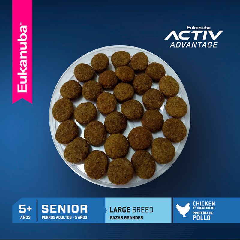 Eukanuba Senior Large Breed alimento balanceado completo para perros adultos de más de 5 años de edad y de razas grandes o gigantes como : Labrador Retriever, Ovejero Alemán, Golden Retriever, Boyero de Berna, Cane Corso, Dogo de Burdeos, Bullmastiff y otras razas o perros mestizos que en su etapa adulta pesan más de 25 kg (razas grandes) o más de 50 kg (razas gigantes). Las fórmulas de EUKANUBA senior están diseñadas para proporcionar la nutrición que los perros mayores necesitan para pelajes brillantes, articulaciones saludables y huesos fuertes. Beneficios: Chicken Protein - Fuente de protei´na de origen animal con un alto porcentje de aminoácidos esenciales altamente digestibles, que permite a las fibras musculares mantenerse, renovarse y recuperarse luego de la actividad normal . Denta Defense - Reduce la formación de sarro en hasta un 55% en 28 días.Con L-carnitina para ayudar a quemar grasas y mantener un peso saludable. Ingredientes: Harina de subproductos de pollo, trigo integral molido, harina de maíz, sorgo integral molido, cebada integral molida, grasa de pollo, sabor natural a cerdo y/o pollo, pulpa de remolacha seca, harina de pescado (fuente de aceite de pescado), producto de huevo seco, levadura de cerveza seca, cloruro de potasio, sal, fructooligosacáridos, hexametafosfato de sodio, vitaminas (suplemento de vitamina E, ácido ascórbico, beta caroteno, acetato de vitamina A, pantotenato de calcio, biotina, suplemento de vitamina B12, mononitrato de tiamina (fuente de vitamina B1), niacina, suplemento de riboflavina (fuente de vitamina B2), inositol, hidrocloruro de piridoxina (fuente de vitamina B6), suplemento de vitamina D3, ácido fólico), semillas de lino molidas, minerales (sulfato ferroso, óxido de zinc, sulfato de manganeso, sulfato de cobre, óxido manganoso, iodato de calcio, carbonato de cobalto), beta caroteno, cloruro de colina, fosfato dicálcico, L-carnitina, antioxidante (BHA y BHT), DL-metionina, luteína.