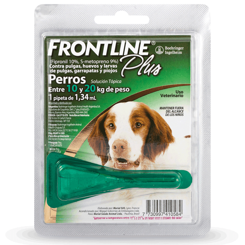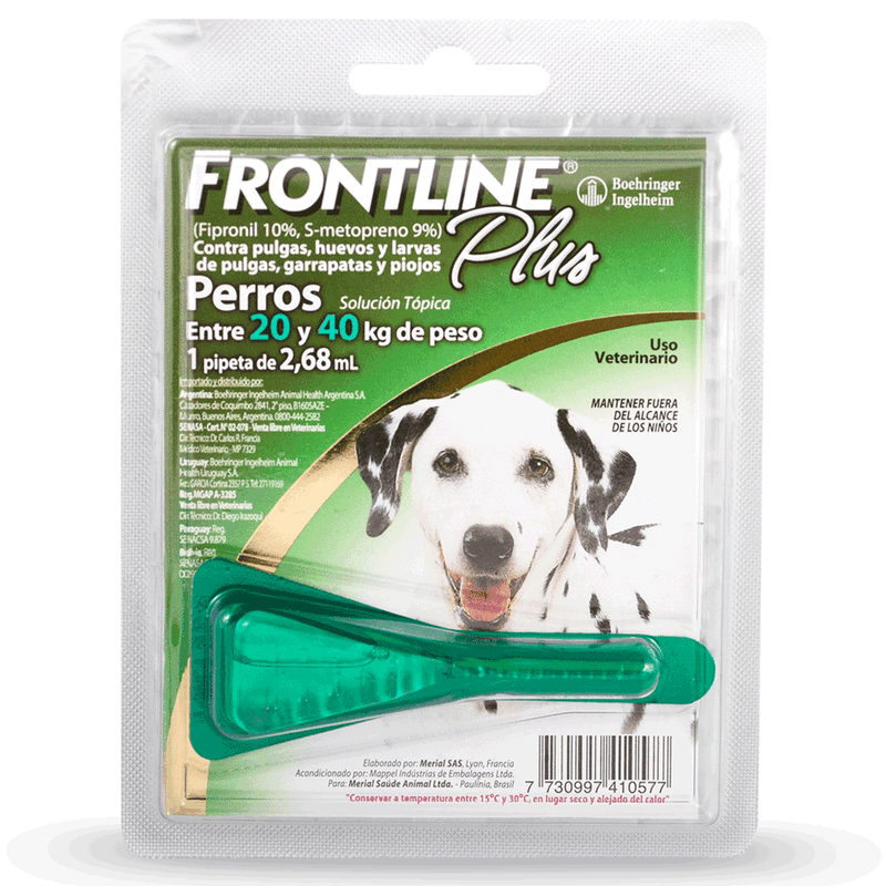 Número de registro en SENASA 02-078 Tipo de matrícula del responsable veterinario Matricula Nacional Número de matrícula del responsable veterinario 9184 Número de habilitación del establecimiento 338/24 Pipeta Frontline Plus Verde para Perros – Protección Completa contra Pulgas y Garrapatas ¡Mantén a tu perro protegido y libre de parásitos! Frontline Plus Verde es una pipeta antiparasitaria de uso tópico desarrollada por Boehringer Ingelheim, indicada para el tratamiento y prevención de infestaciones por pulgas (Ctenocephalides spp.), garrapatas (Rhipicephalus sanguineus, Ixodes ricinus, Dermacentor spp.) y piojos masticadores (Trichodectes canis) en perros. Su fórmula combina dos potentes principios activos: Fipronil y (S)-Metopreno, que actúan eliminando los parásitos por contacto y previniendo el desarrollo de estadios inmaduros de pulgas. Beneficios clave: Elimina pulgas, garrapatas y piojos por contacto, sin necesidad de que piquen. Efecto residual prolongado: hasta 2 meses contra pulgas y 1 mes contra garrapatas. Previene la reinfestación del hogar al eliminar huevos y larvas de pulgas presentes en el ambiente. Apto para perros a partir de las 8 semanas de edad y más de 2 kg de peso. Seguro para hembras gestantes y lactantes. Modo de uso: Aplicación externa: aplicar el contenido total de la pipeta directamente sobre la piel seca del perro, en la zona de la nuca o entre los omóplatos, separando el pelo para facilitar la absorción. Frecuencia: repetir la aplicación cada 4 semanas para mantener una protección constante. Precauciones: evitar bañar al perro 48 horas antes o después de la aplicación para asegurar la eficacia del producto. Presentaciones según el peso del perro: Perros de 2 a 10 kg: pipeta de 0,67 ml Perros de 10 a 20 kg: pipeta de 1,34 ml Perros de 20 a 40 kg: pipeta de 2,68 ml Perros de 40 a 60 kg: pipeta de 4,02 ml