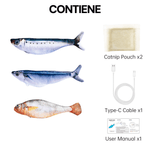 El pack incluye tres peces interactivos, ideales para rotar durante la semana o para hogares con más de un gato. Su batería recargable por USB facilita su uso diario sin necesidad de pilas y su motor desmontable permite una limpieza sencilla.