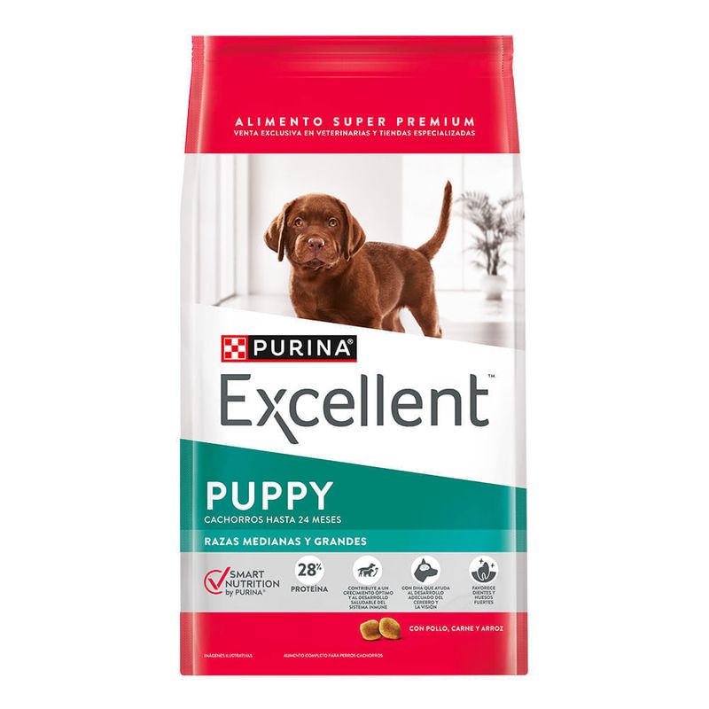 En su primer año de vida los cachorros necesitan una nutrición óptima para favorecer su desarrollo y crecimiento. PURINA® Excellent® PUPPY CHICKEN & RICE ofrece una fórmula completa y balanceada a base de proteínas de alta calidad, incluyendo tocoferoles mezclados -fuente de vitamina E- y sin colorantes ni saborizantes arti?ciales, para garantizar la calidad nutricional de sus fórmulas y un sabor único e irresistible.