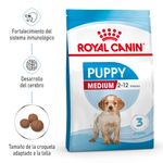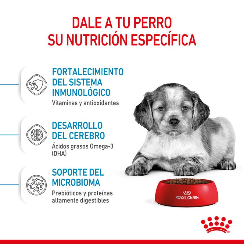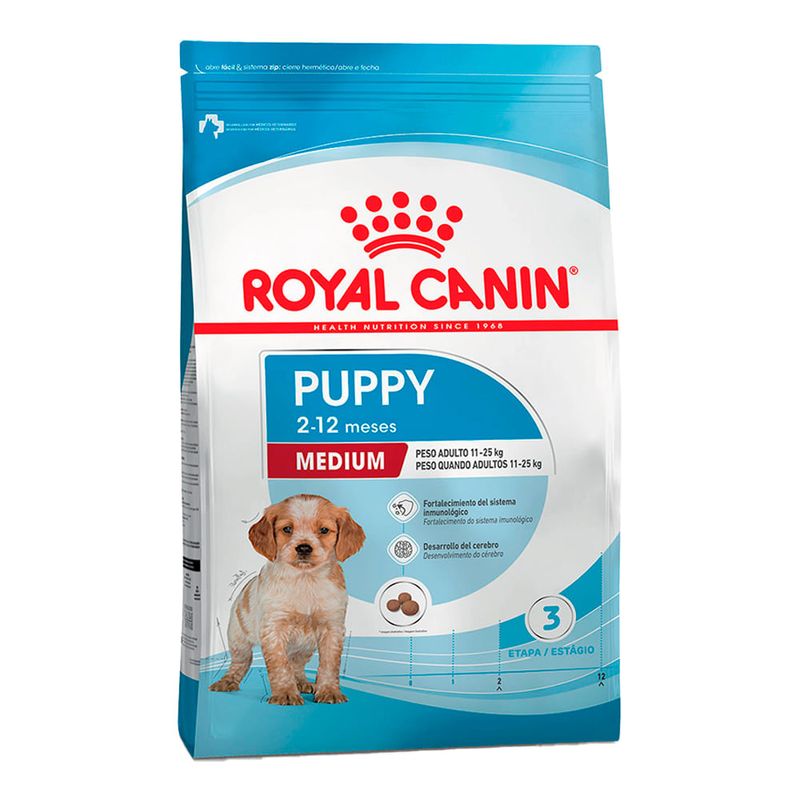 Alimento balanceado completo para caninos cachorros de talla mediana (peso adulto entre 11 y 25 kg), de 2 a 12 meses de edad. Royal Canin Medium Puppy ayuda a promover una óptima seguridad digestiva y una buena conformación de las heces gracias a la incorporación de proteínas de alta digestibilidad (L.I.P.*) con limitada fermentación en el colon. Además, contribuye a favorecer a un ecosistema intestinal equilibrado gracias a la presencia de prebióticos (FOS, MOS) que ayudan a estimular el desarrollo de la flora bacteriana benéfica y limitan el crecimiento de la flora patógena. Esto se debe a que el sistema digestivo del cachorro se irá desarrollando paulatinamente, pero es más delicado y con menor capacidad que el de un perro adulto. Esta situación debe ser tenida en cuenta especialmente cuando el cachorro se enfrente a enfermedades infecciosas y/o parasitarias o en situaciones de estrés. Royal Canin Medium Puppy ayuda a reforzar las defensas naturales del cachorro gracias a un complejo de antioxidantes patentado (Vitamina E, vitamina C, luteína y taurina) y a los manano-oligosacáridos para promover el desarrollo de anticuerpos, ya que la protección transmitida por la madre a través del calostro comienza a declinar entre la 4ta. y 12va. semana de vida, y con su propio sistema inmune aún inSenior, el cachorro se vuelve susceptible al contagio de enfermedades infecciosas y parasitarias. *L.I.P: proteína seleccionada por su alta digestibilidad. Beneficios: Ayuda a promover una óptima seguridad digestiva y una buena conformación de las heces.Contribuye a favorecer a un ecosistema intestinal equilibrado.Ayuda a reforzar las defensas naturales del cachorro. Ingredientes: Maíz, harina de subproductos de pollo, grasa vacuna, harina de carne L.I.P.*, harina de trigo, proteína vegetal purificada L.I.P.* (gluten de trigo), pulpa de remolacha, harina de gluten de maíz, arroz, hidrolizado de hígado de pollo, sales minerales, aceite de pescado, aceite de soja, zeolita, levadura de cerveza, vitaminas, fructo-oligosacáridos (FOS), DL-metionina, manano-oligosacáridos (MOS), extracto de yuca, taurina, L-lisina, betaglucanos, extracto de rosa de la India (rico en luteína), oligoelementos quelados, oligoelementos, betacarotenos. (*) Low Indigestible Protein: proteína seleccionada por su alta asimilación. Vitaminas: Vitamina A, vitamina D3, vitamina E, vitamina C, pantotenato de calcio, niacina, vitamina B1, vitamina B2, vitamina B6, ácido fólico, biotina, vitamina B12, colina. Sales minerales: Fosfato monopotásico, cloruro de sodio, sorbato de potasio, fosfato monocálcico. Oligoelementos: Sulfato de hierro, óxido de zinc, óxido de manganeso, sulfato de cobre, iodato de calcio, selenio orgánico. Oligoelementos quelados: Zinc, manganeso, cobre. Conservantes y antioxidantes: BHA, galato de propilo y ácido cítrico.