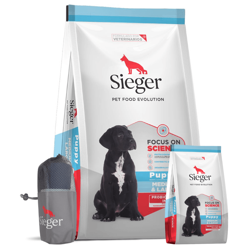 Sieger Cachorro es un alimento Premium para perros cachorros de de razas medianas y grandes hasta los 15 meses de edad. Este alimento posee una fórmula exclusiva que está enriquecida con proteínas de alta calidad, Ácidos grasos Omega 3 y 6 y un balance ideal de vitaminas y minerales, que ayudan al crecimiento saludable de tu cachorro. La fórmula también puede ser utilizada en mascotas gestantes o lactantes.